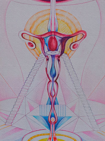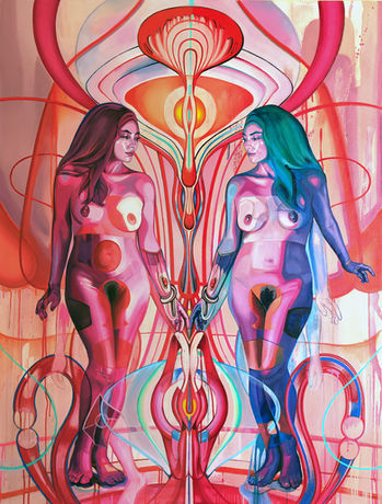 In this work, two female figures are intertwined within a larger, sacred structure: the Womb. This is not only the physical womb, but the Cosmic Womb—a universal matrix of creation and energy. The womb, in this context, becomes both a literal and symbolic portal, echoing the interconnectedness between body, spirit, and universe.